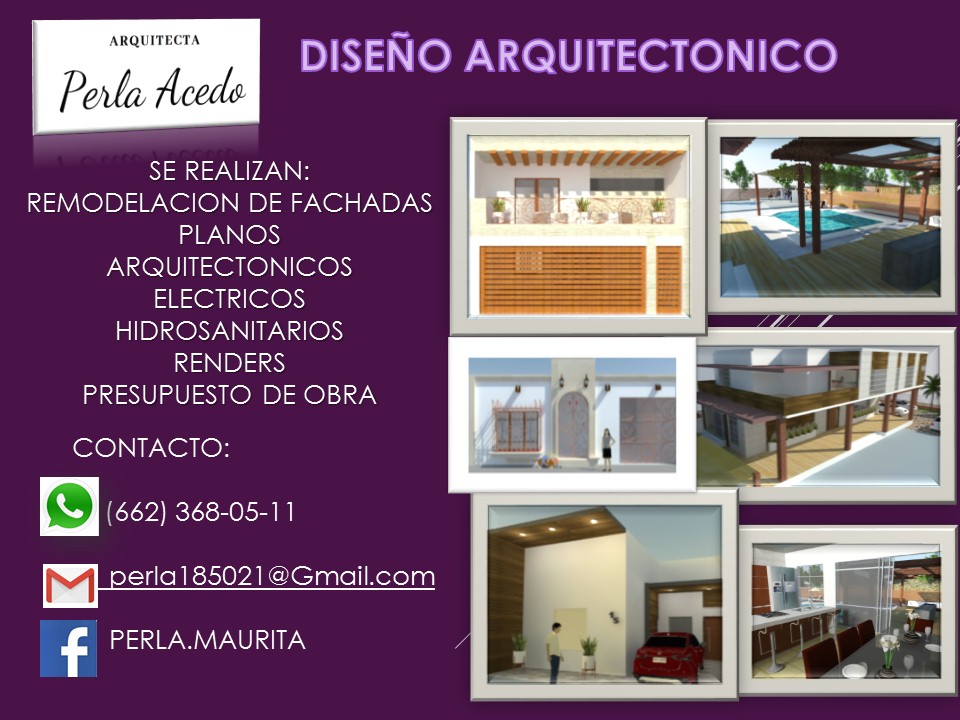 ARQUITECTA PERLA ACEDO — Arquitecto Ubicado en Hermosillo. Horario: lunes: Abierto 24 horas; martes: Abierto 24 horas; miércoles: Abierto 24 horas; jueves: Abierto 24 horas; viernes: Abierto 24 horas; sábado: Abierto 24 horas; domingo: Abierto 24 horas | Calificación: 4.9 (25 opiniones) Sitio web: https://www.facebook.com/ArqPerla-Acedo-100876285720380
