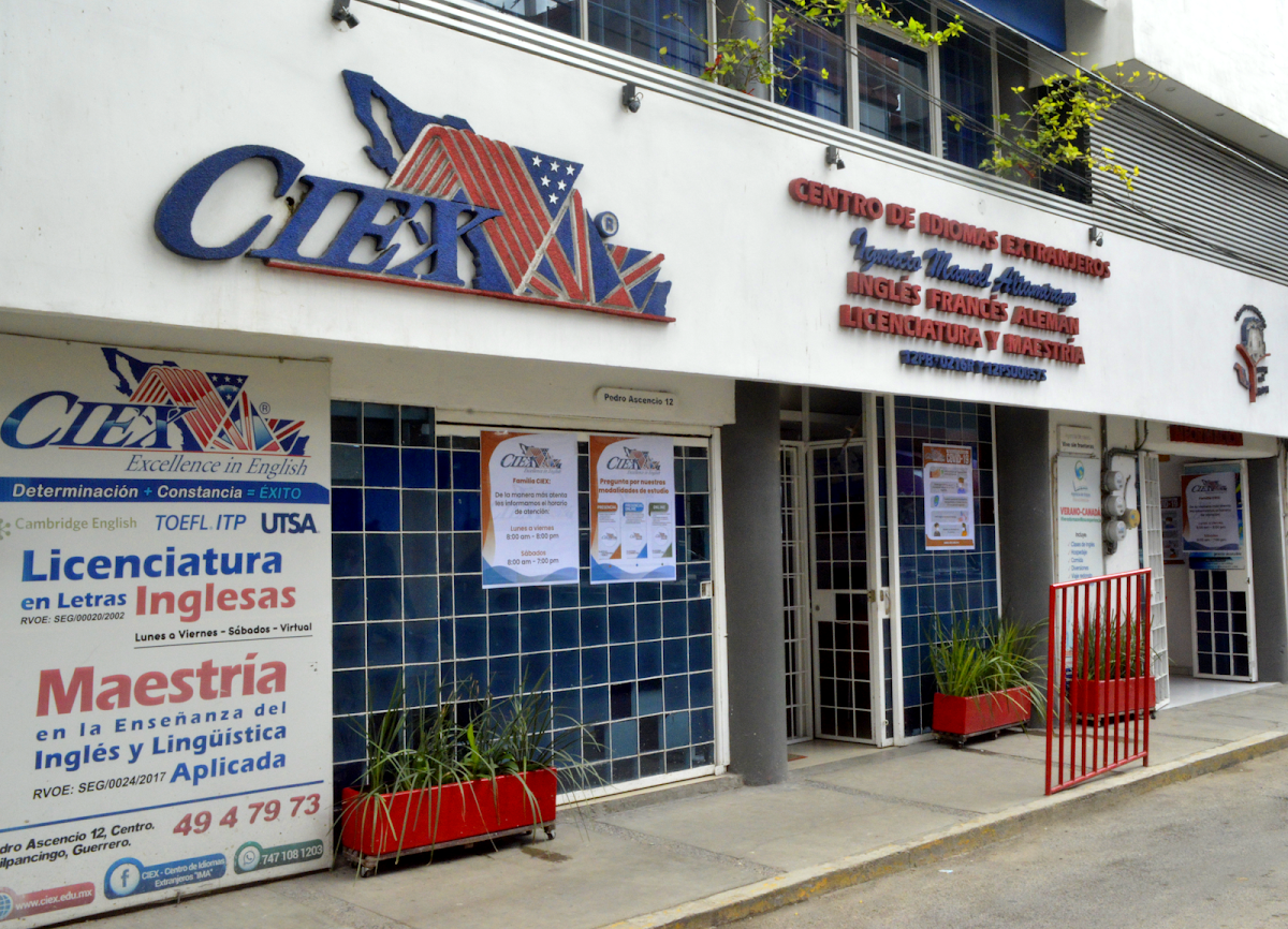 CIEX Centro de Idiomas Extranjeros “Ignacio Manuel Altamirano” — Escuela De Idiomas Ubicado en Chilpancingo de los Bravo. Horario: lunes: 8:00–20:00; martes: 8:00–20:00; miércoles: 8:00–20:00; jueves: 8:00–20:00; viernes: 8:00–20:00; sábado: 8:00–18:00; domingo: Cerrado | Calificación: 4.6 (34 opiniones) Sitio web: http://ciex.edu.mx/